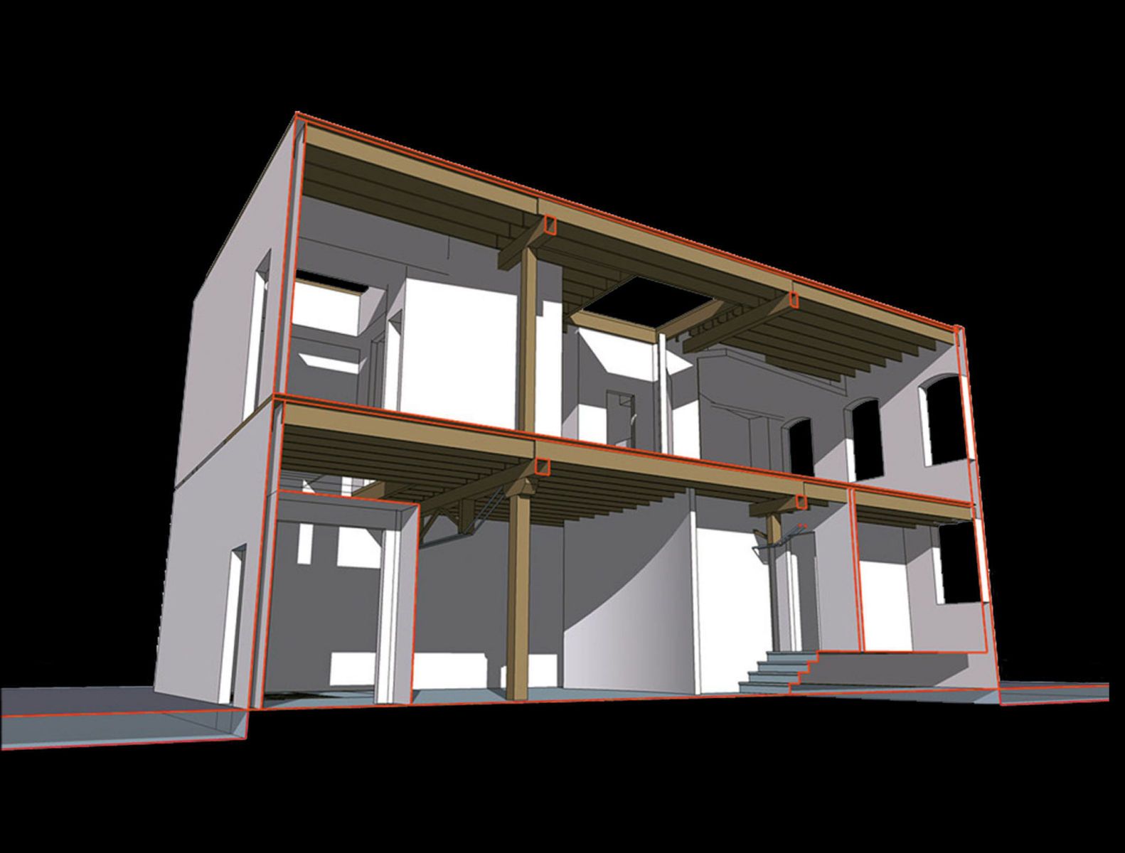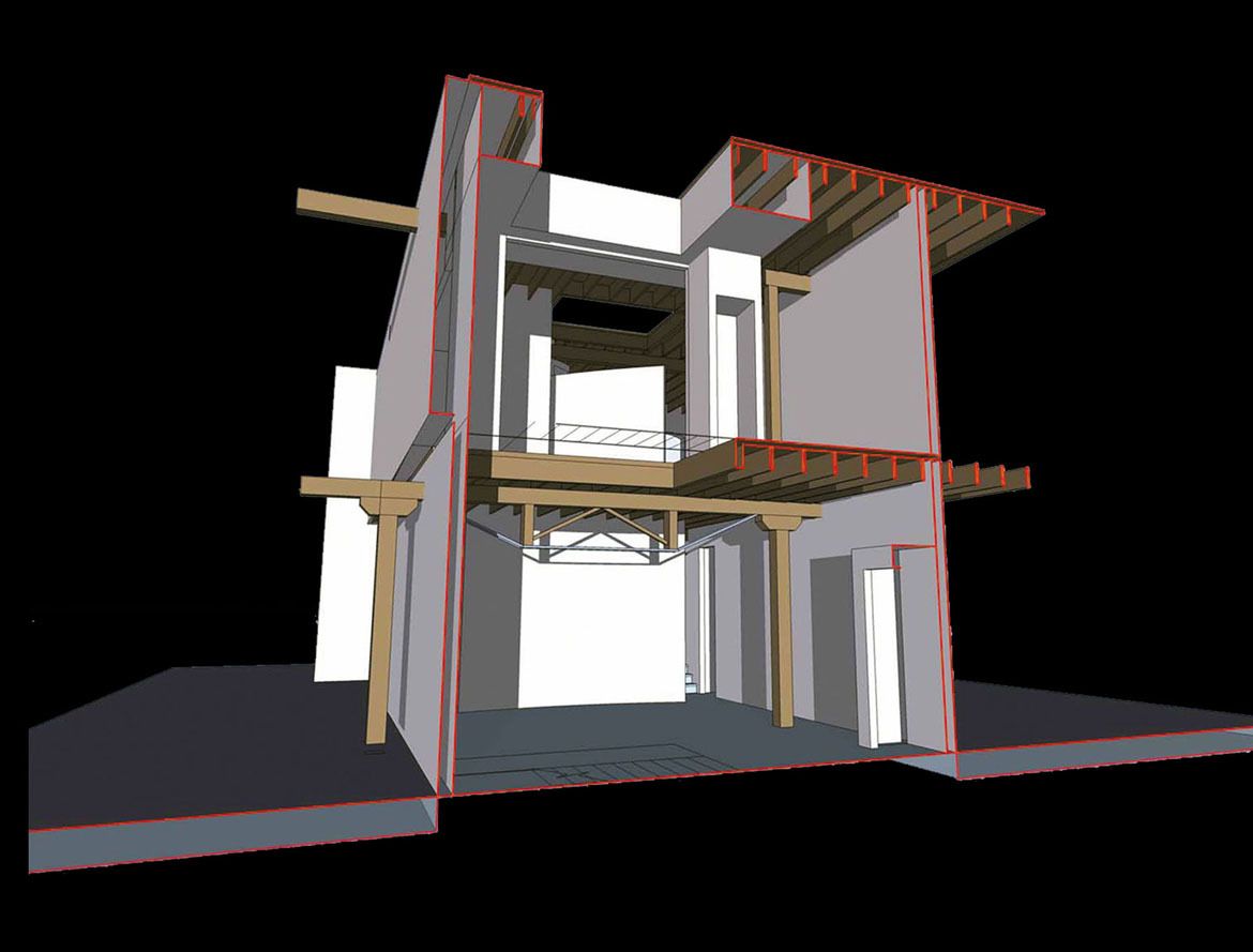 Translucent panels behind the bed allow light to filter in from the open stair beyond.